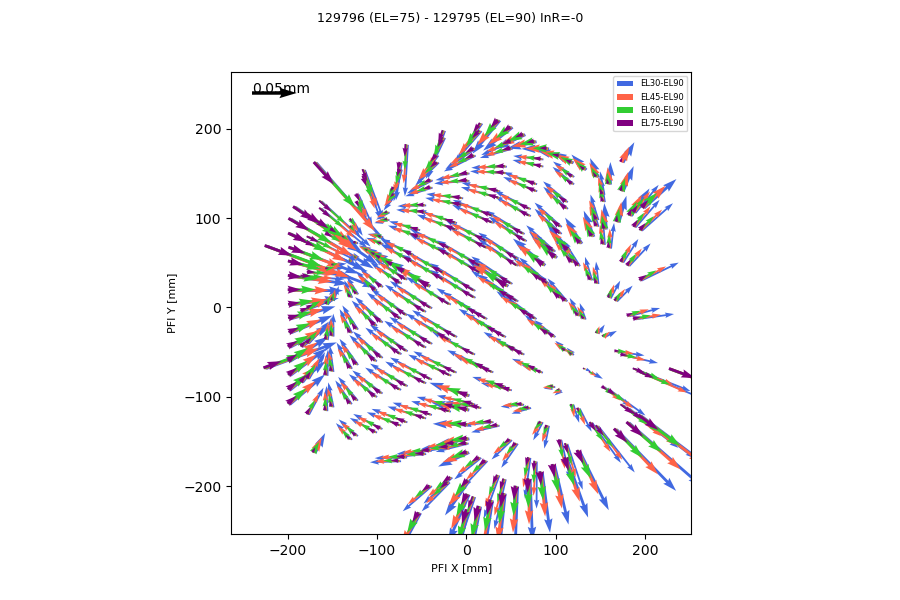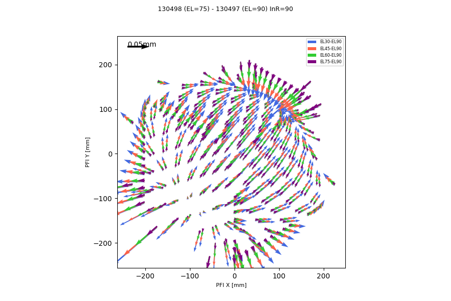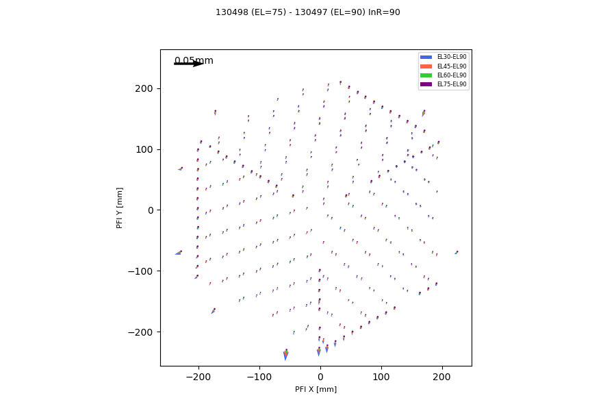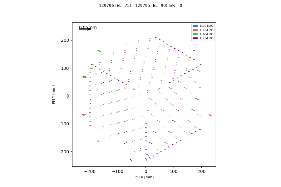 The shift is on a given pattern, which quite resembles to that seen HSC and MCS test with pin-hole mask. Also, the displacement is scaled by zenith angle. This pattern was actually implemented in the past, but its elevation dependency was not considered (measured). This displacement affects distortion measurement by FFs in later stage.