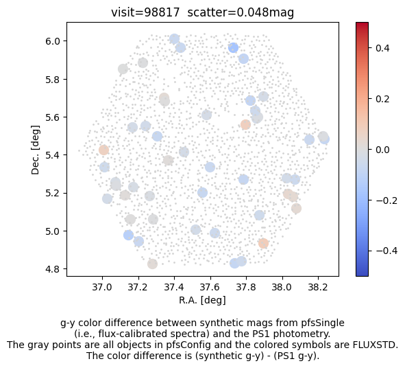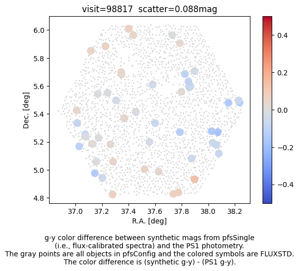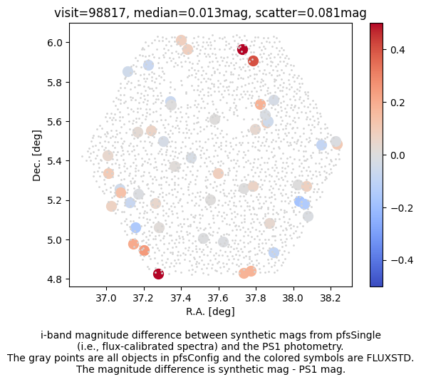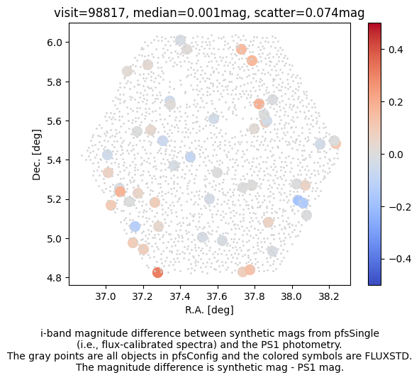 After applying the fix for PIPD2D-1361, we clearly observe the spatial variation of the flux calibration vector. The variation likely has two components; the global pattern due to the global offset, rotation, and scale difference, and fiber-to-fiber offset. We want to correct for the former with, e.g., low-order polinomials. As the seeing is a function of wavelength, a fiber offset introduces a wavelength-dependent flux loss. We thus need to allow the flux calibration vector to vary both spatially and along the wavelength. The correction can be estimated by comparing the PS1 magnitudes and synthetic PS1 magnitudes of each FLUXSTD.